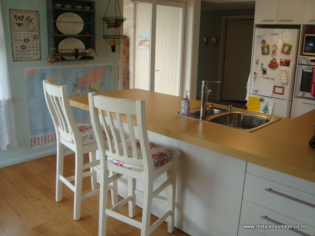 | This shot was taken the very day the kitchen was installed, hence random-stuff-everywhere look! They are the 'old' bar stools I have replaced with my shabby chic ones. |